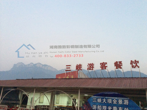 随着公司逐步发展壮大,我们湖南雅致彩钢业务范围也在不断扩大,目前业务已成功跨越了长江。坐落于宜昌市夷陵区三峡大坝,其中有一地需建游客餐饮中心,约500平方,该项目负责人刘总找到我们,要求帮他们设计一个餐饮中心,公司领导非常重视此项目,多次与客户沟通,将我们专业的想法与客户的要求进行整合,经过长达20天左右的讨论,终于达成一致。公司立即组织生产、安装,在客户要求的时间内,非常专业的完成了此项工程,得到客户的认可,目前该餐饮中心已顺利投入使用。