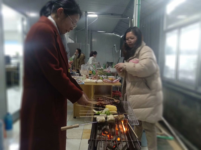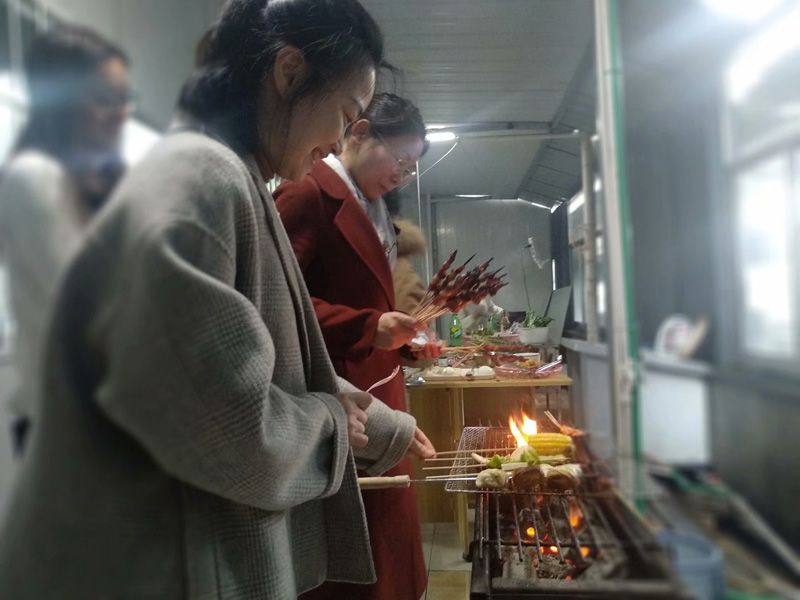你看,伙伴们正在认真地清洗和穿插各式菜品,当然还要把火升起来: