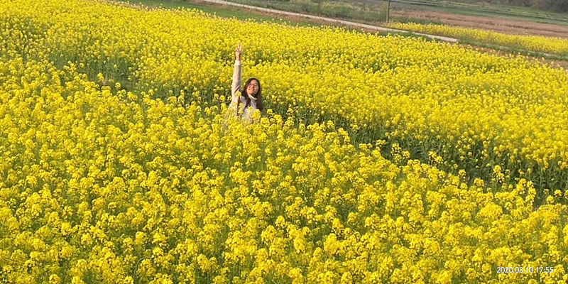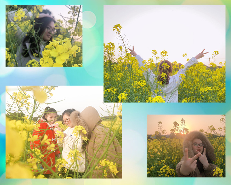 我们一起在油菜花丛中穿梭、躲藏。闻着夹杂着泥土芬芳的阵阵花香,踏着松软的土地,我们好像身处天堂、仙境一般。金黄的花丛让我们流连忘返。