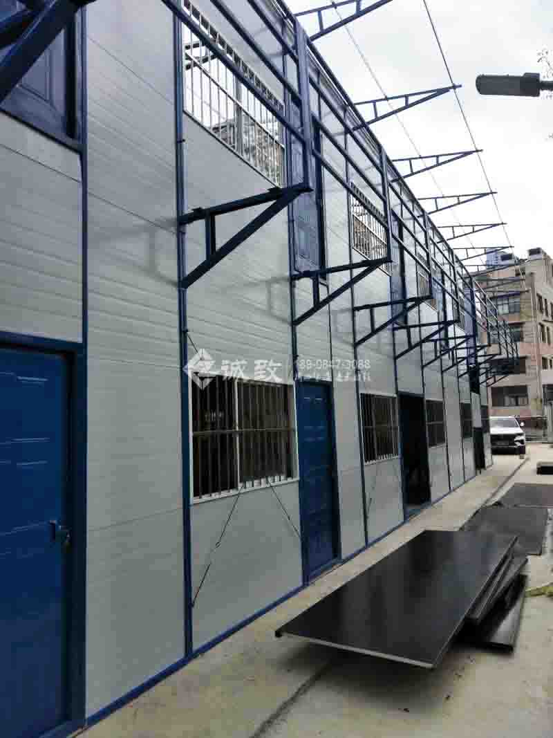 深蓝色的C型钢立柱、牛腿、雨棚架、标准门搭配上银色的窗户,白色的墙板,舒适感由然而生。