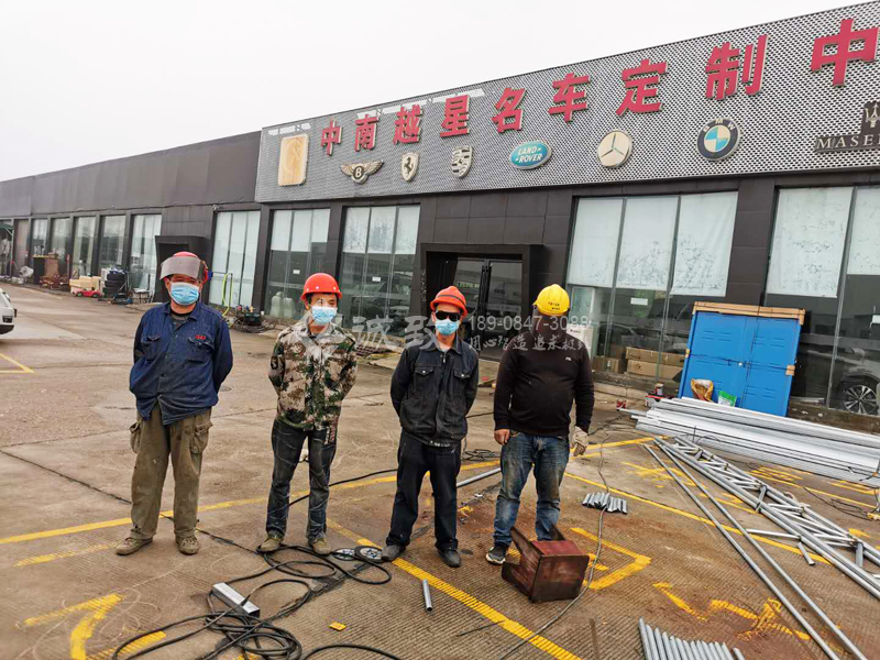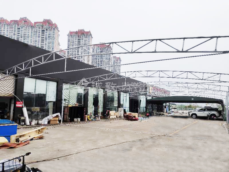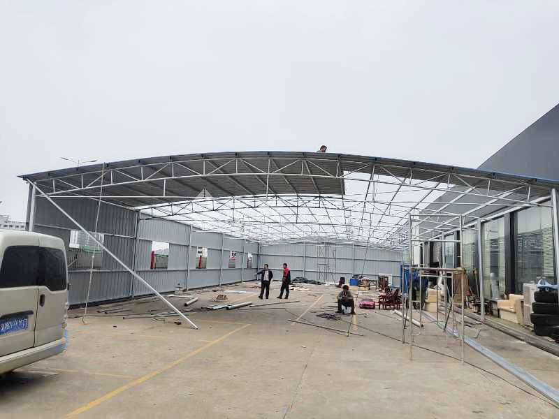 中南越星名车定制车库棚,宽13m,长28.3m,净高3.1m,满足车辆停放展示需求。立柱采用2.0mm厚D110mm 圆管,弧形梁则采用D48与D32圆管焊接而成,白色单瓦墙面与蓝色单瓦屋面组成了车库棚的外部景色。