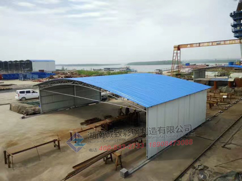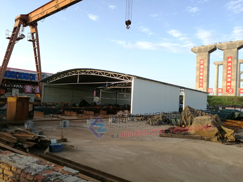 本工程为两个可移动式钢筋加工棚,总共300多平方,移动棚跨度达15米,侧面封板,采用铁轨做轨道,为我们湖南诚致独创的产品,移动棚设计新颖,使用方便,四人可轻松推动,深得客户喜欢,后来客户下单让我们再做两个类似的移动棚。